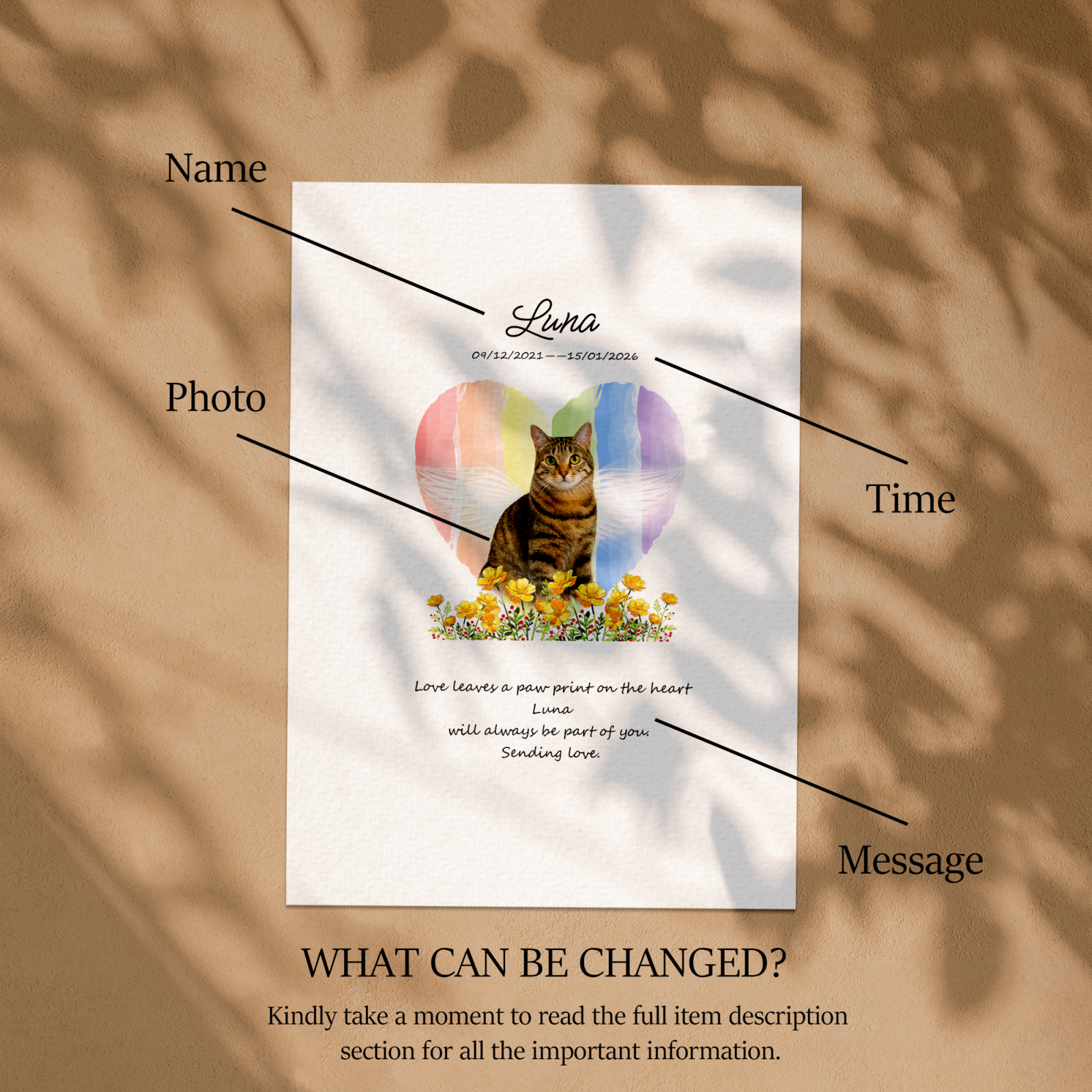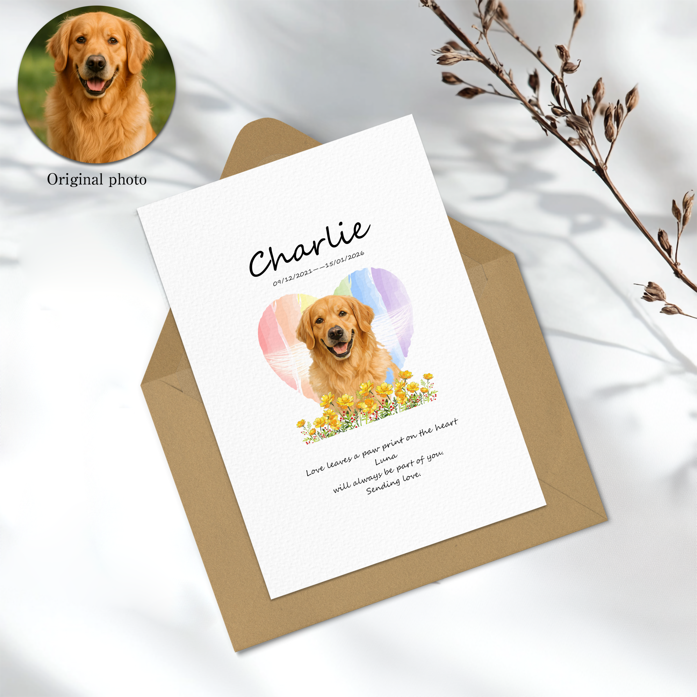 This is a personalized pet memorial card created to express sympathy, remembrance, and quiet love after the loss of a beloved pet. You can customize it with a pet photo, pet name, and a short message, then choose either a digital version or a printed, gift-ready card.